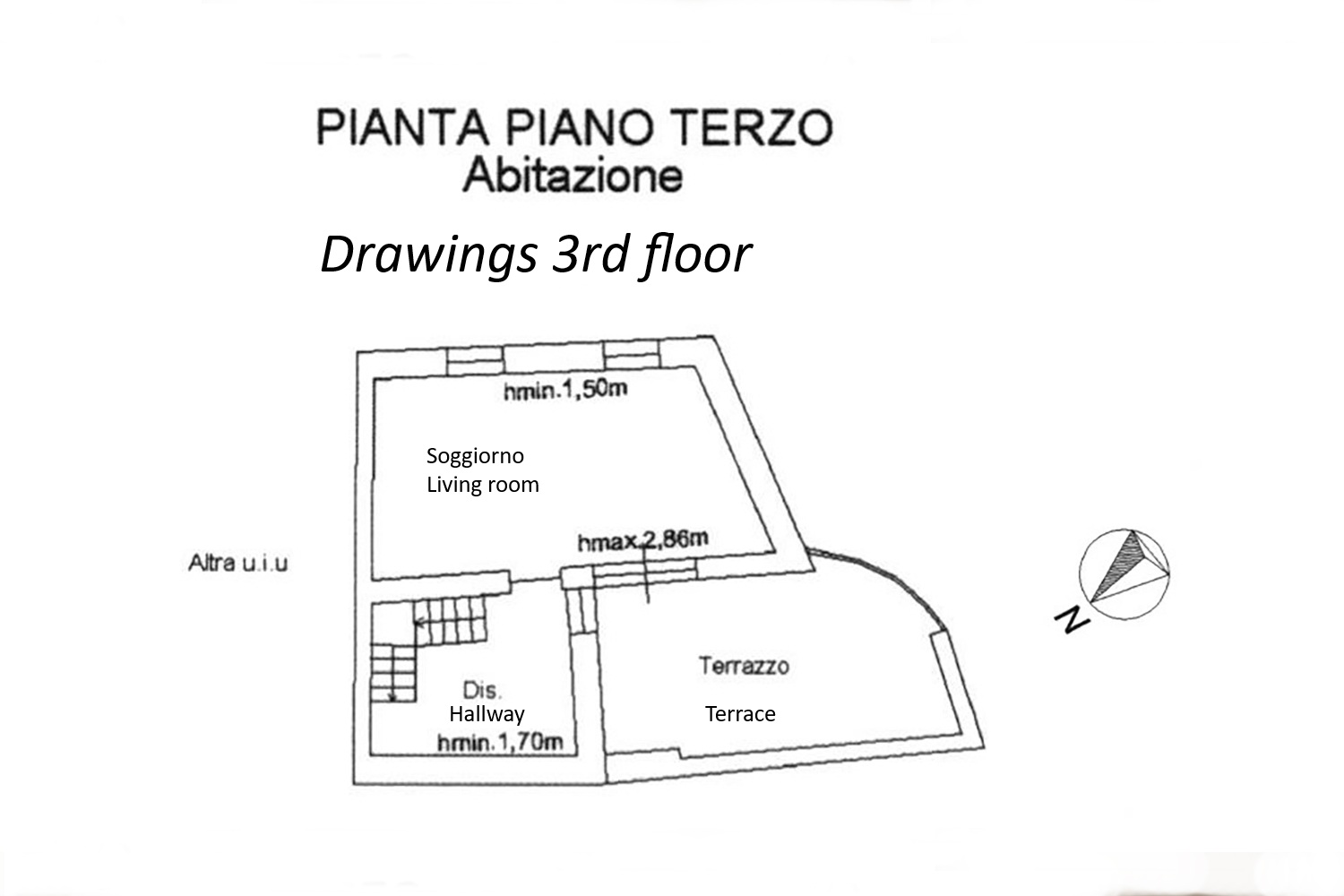Top floor offering a hallway and a bright living room with direct access to a partially covered rooftop terrace of approximately 15 sqm.