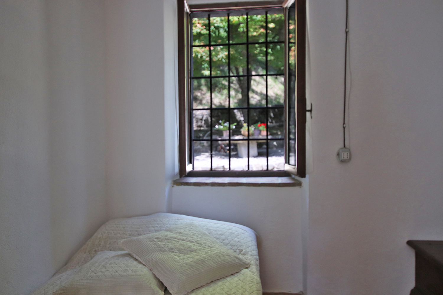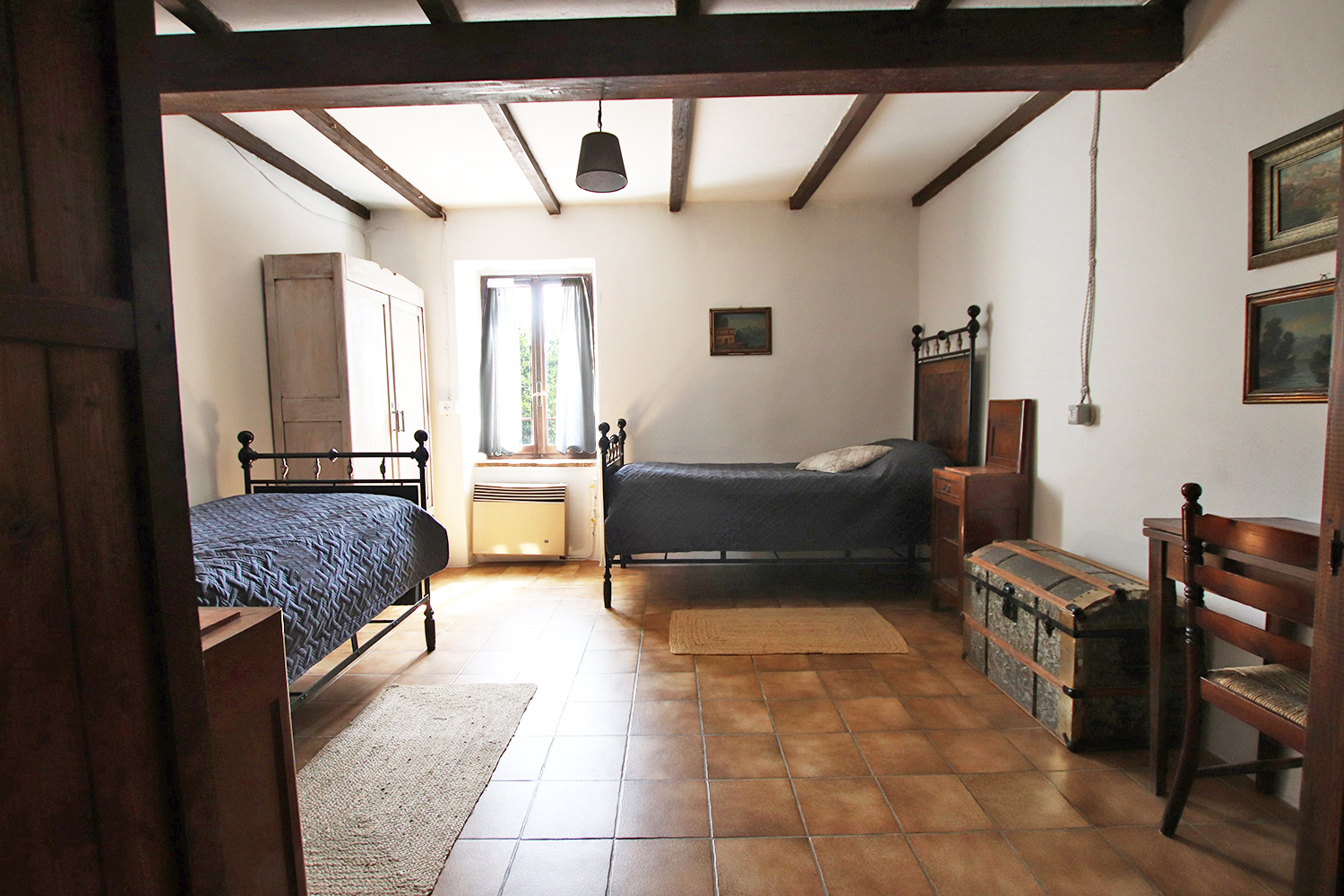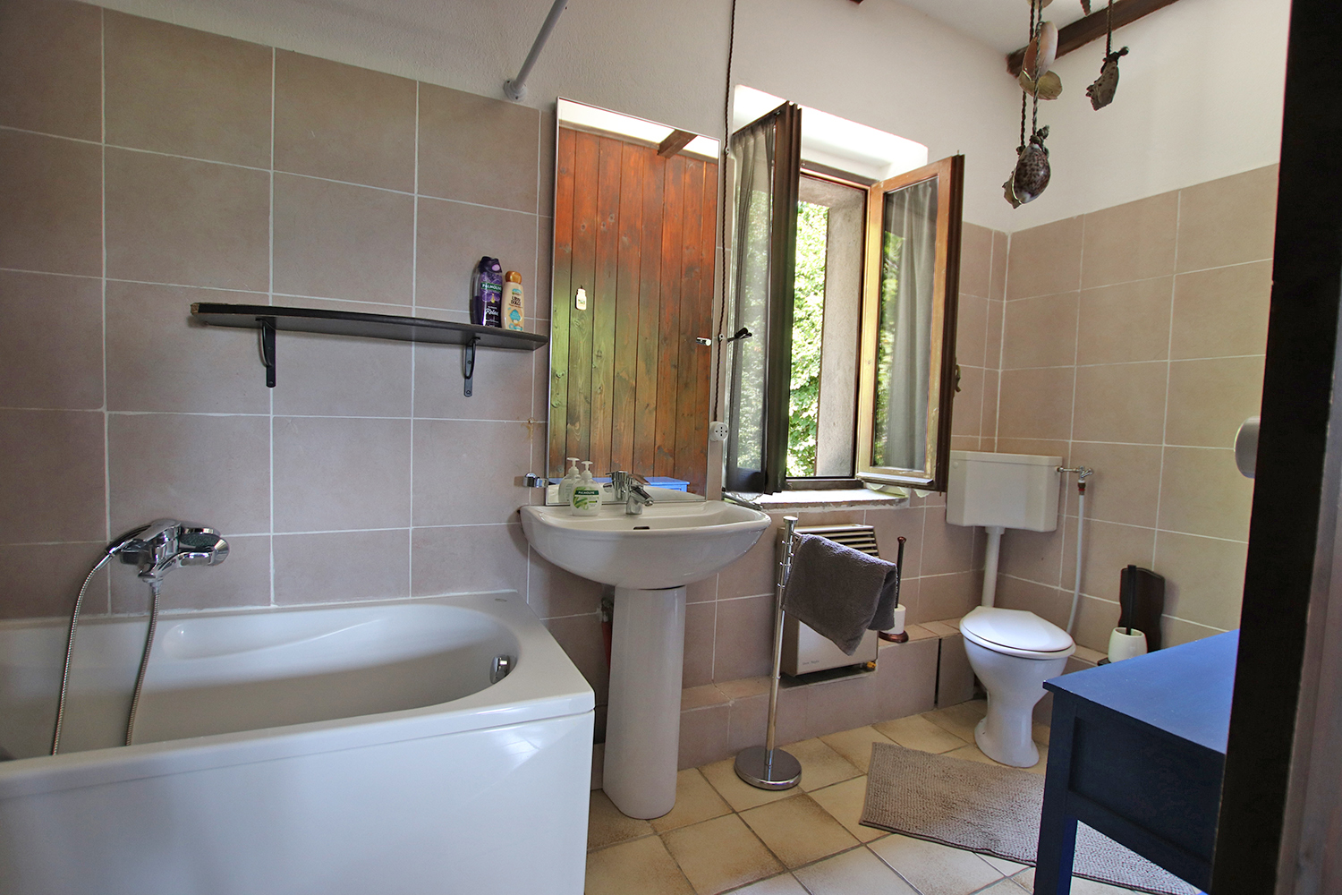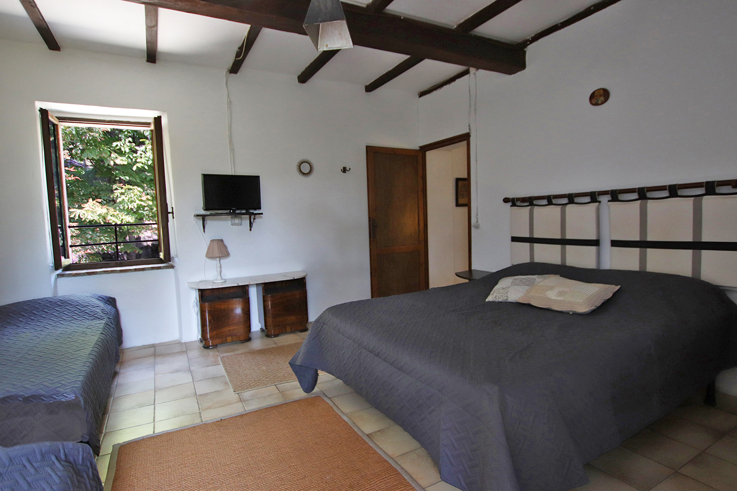 On the upper floors there are a total of four double rooms, all with genuine and rustic details preserved. All bedrooms have an en-suite bathroom and floor-to-ceiling windows facing the garden and overlooking the valley.