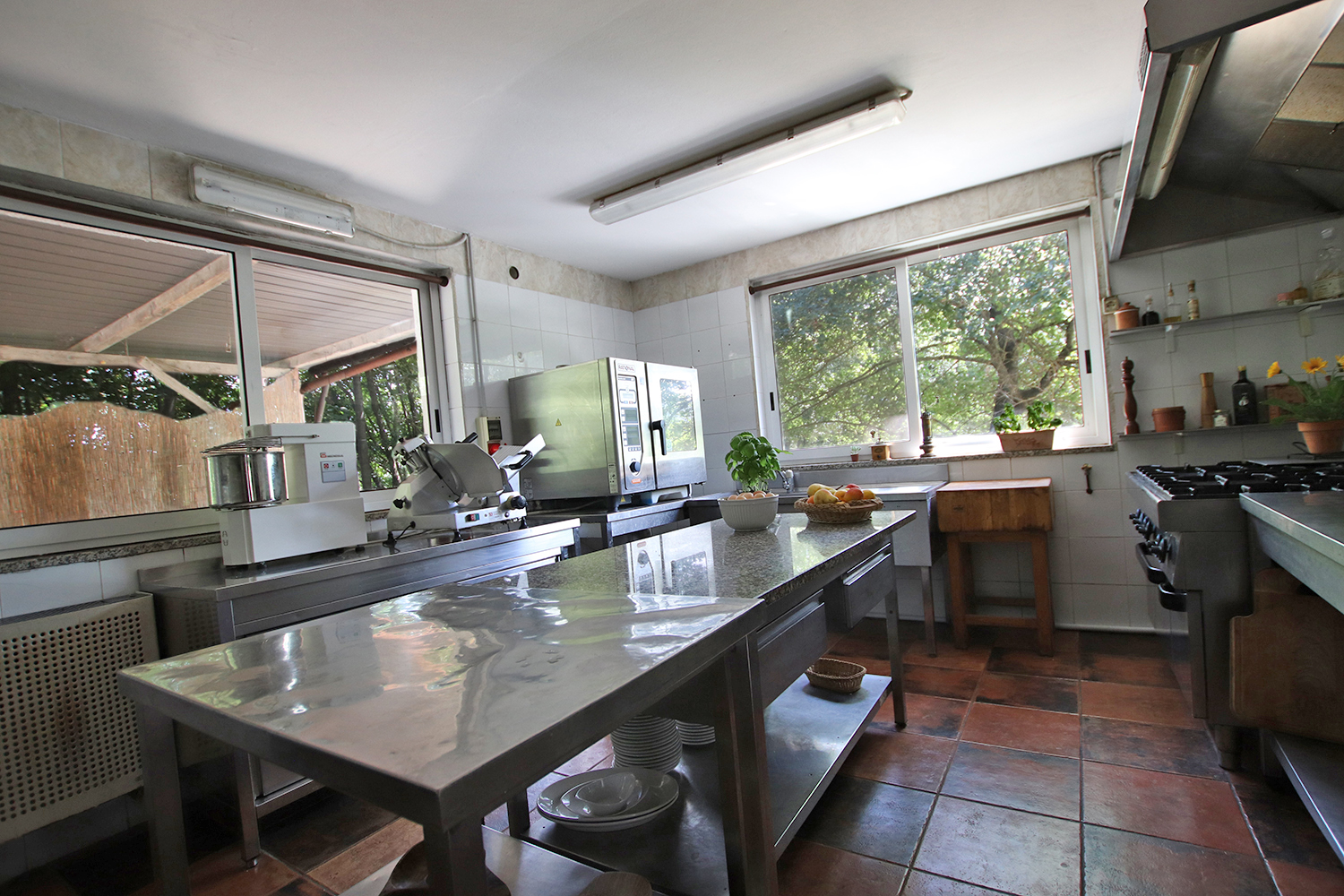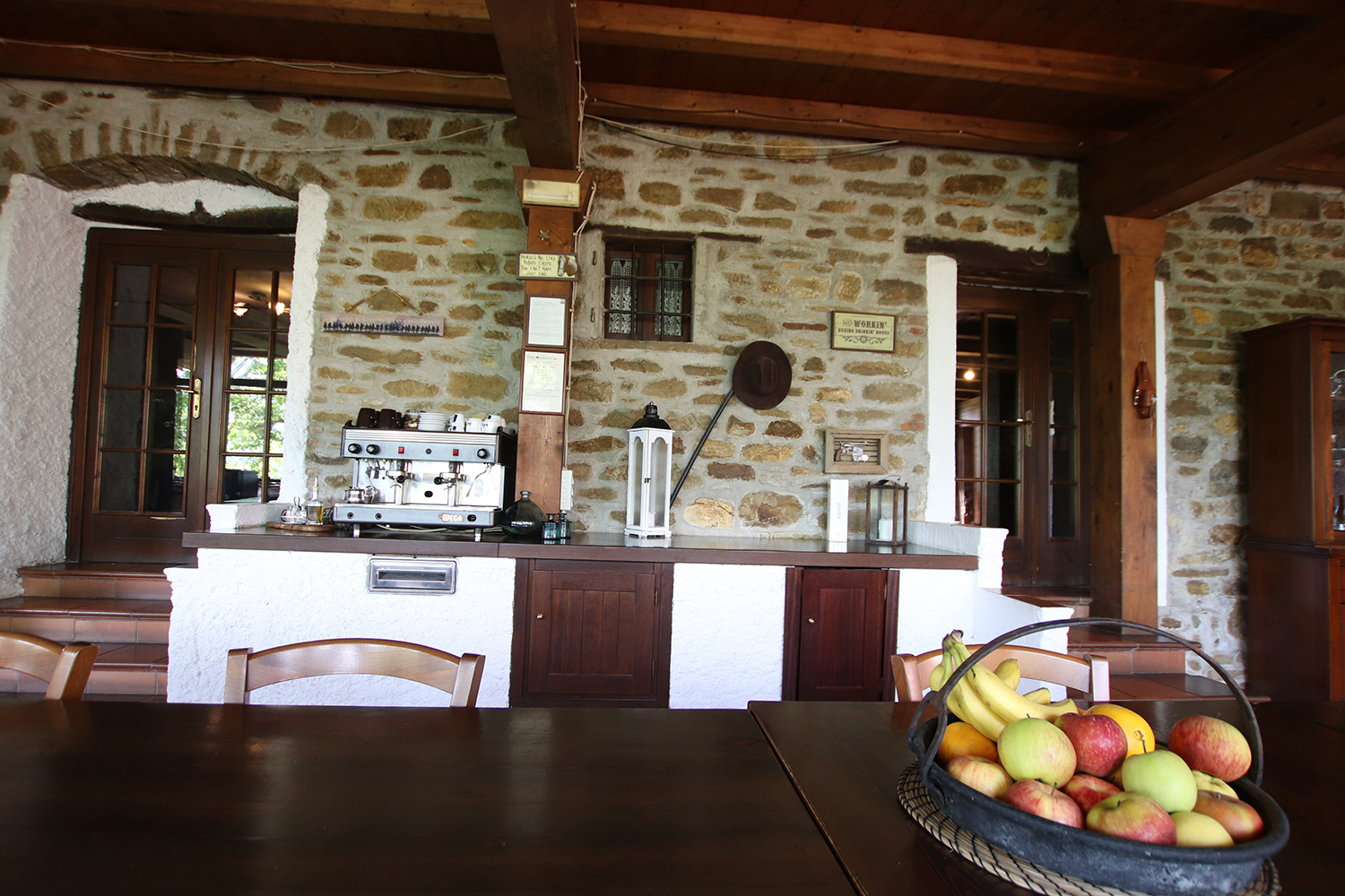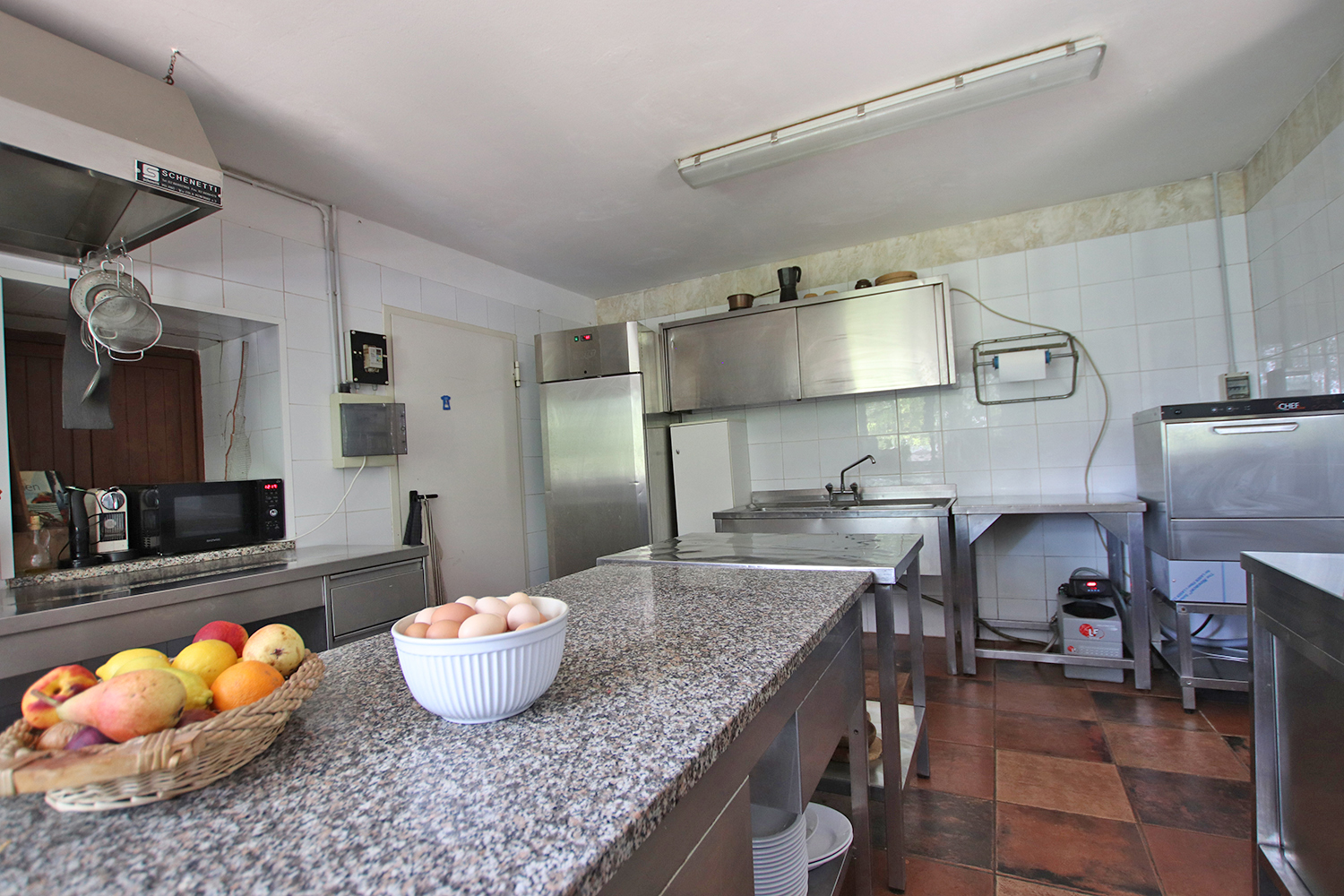 The ancient stone house from 1900 consists of three floors. On the lower level we find a large, very charming living room where a large number of people can fit along the classic long table. On the lower level there is also a fully equipped restaurant kitchen, two rooms that are used as a bedroom/storage room and a TV room and adjacent to these a bathroom. The large hall can be separated with a retractable glass wall.