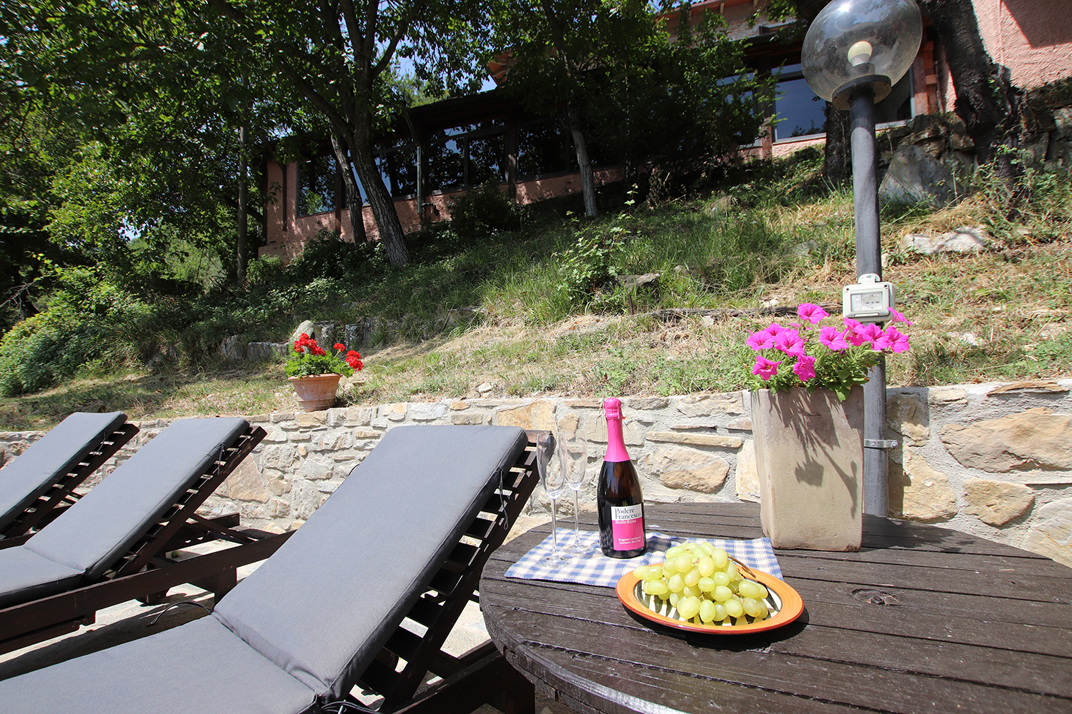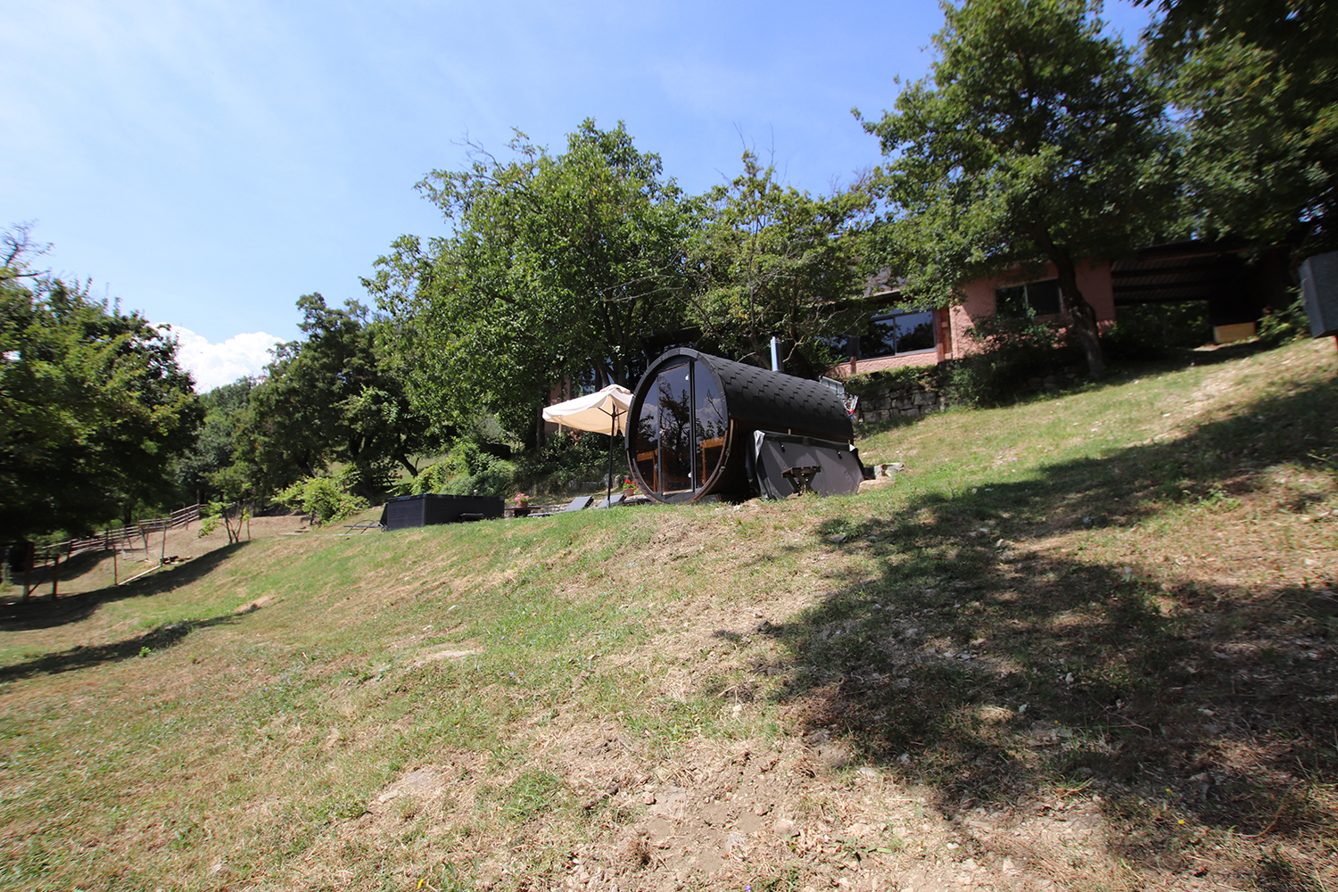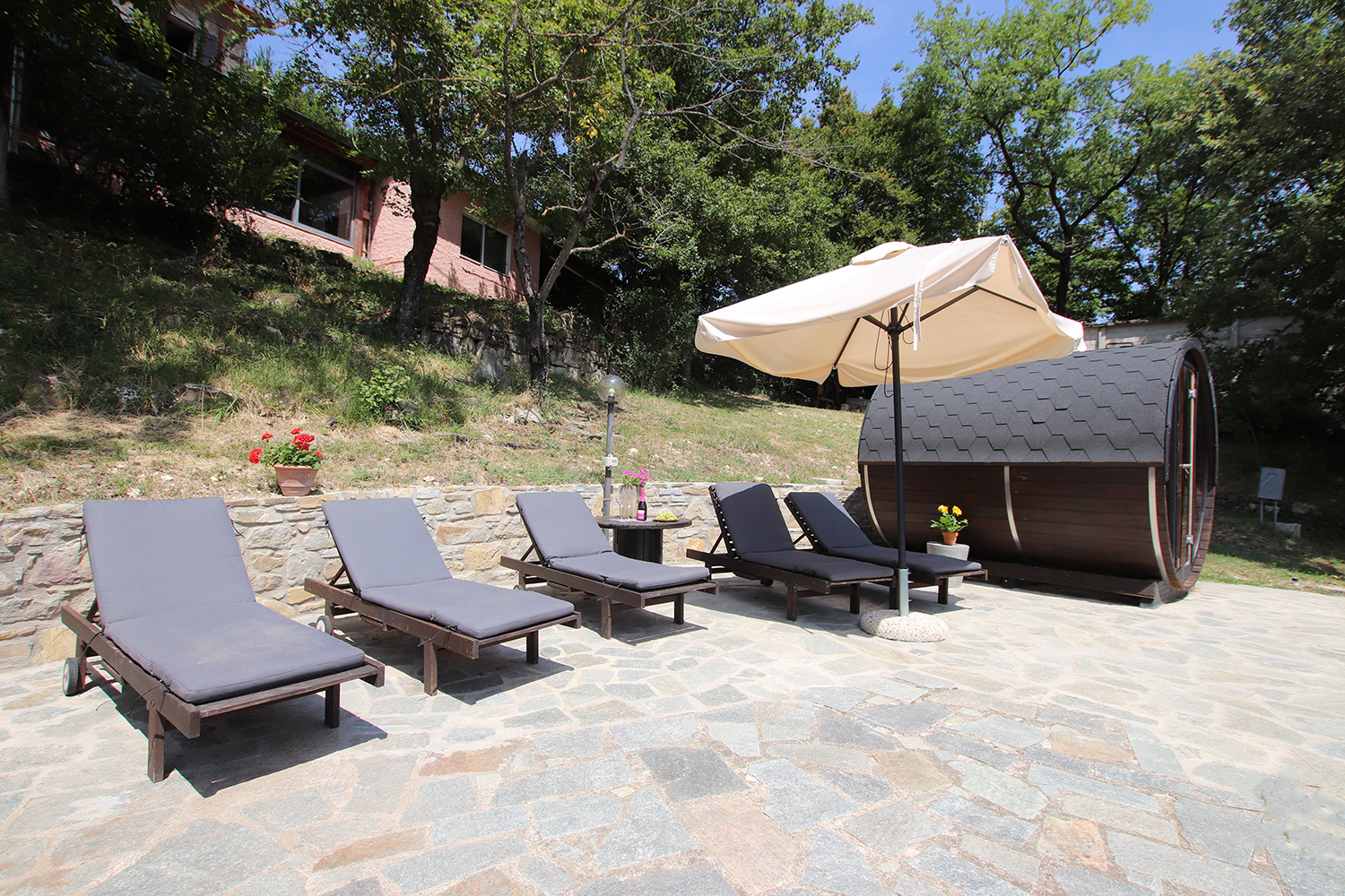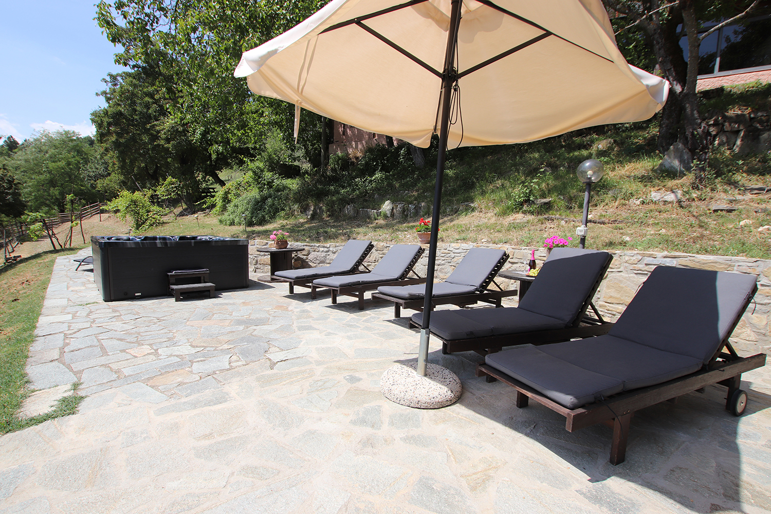 Below the house there is a very nice spa area with a 220×220 jacuzzi, sunbeds and a wood-burning sauna with a panoramic window towards the valley.