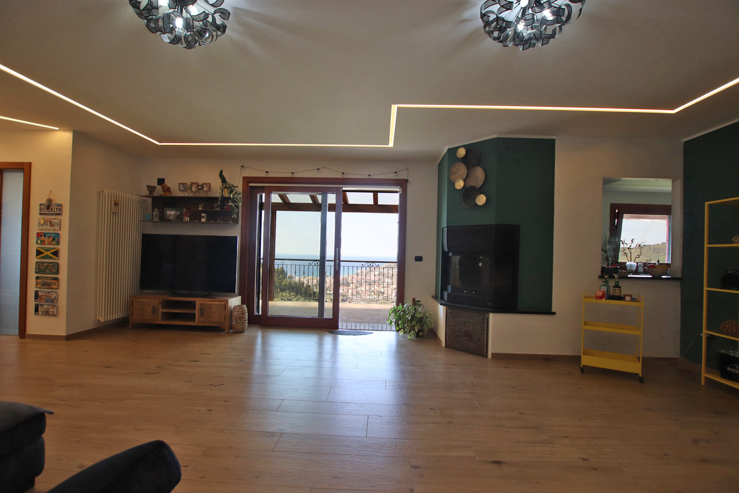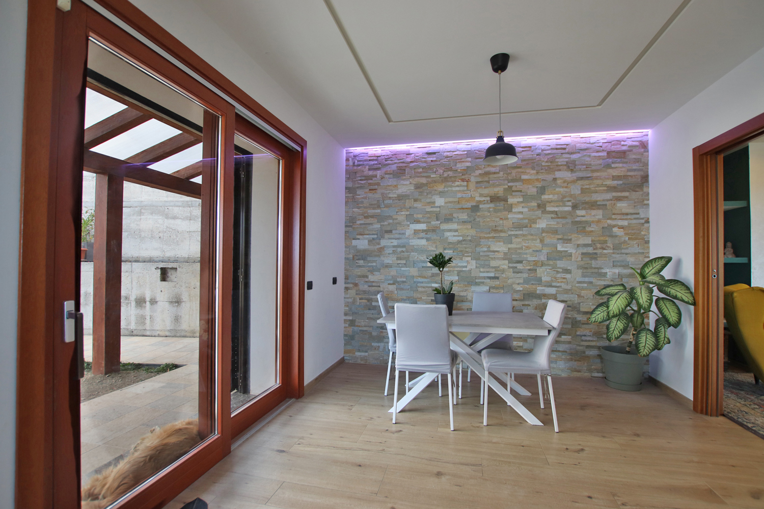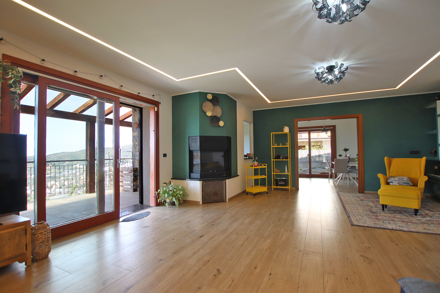 The interior opens into a bright and welcoming living area, where a stylish pellet fireplace creates a warm, inviting atmosphere. Elegant suspended ceilings with integrated LED lighting and a built-in sound system enhance the space, allowing you to tailor both lighting and audio to suit any mood.