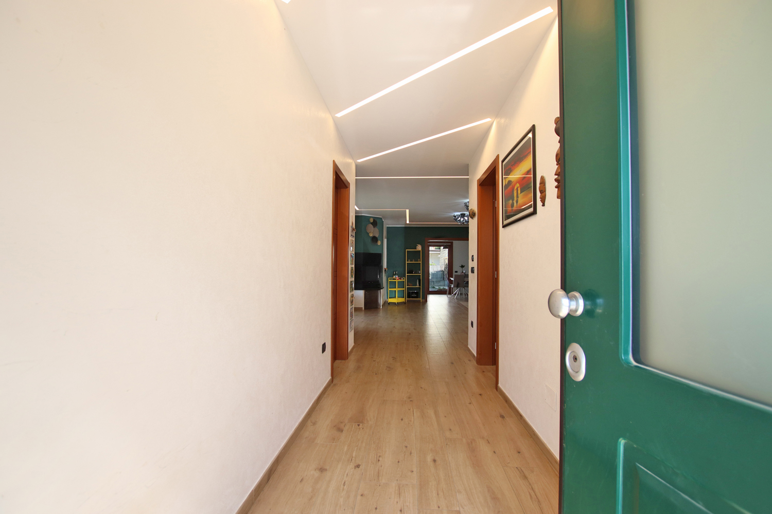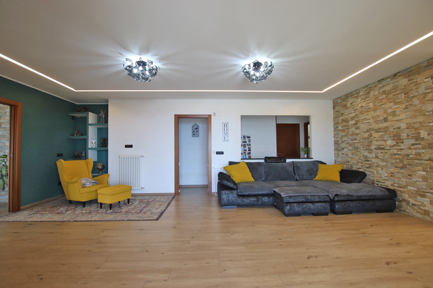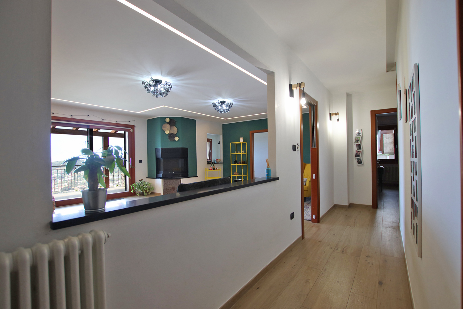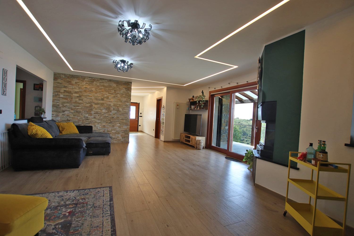 The interior opens into a bright and welcoming living area, where a stylish pellet fireplace creates a warm, inviting atmosphere. Elegant suspended ceilings with integrated LED lighting and a built-in sound system enhance the space, allowing you to tailor both lighting and audio to suit any mood.