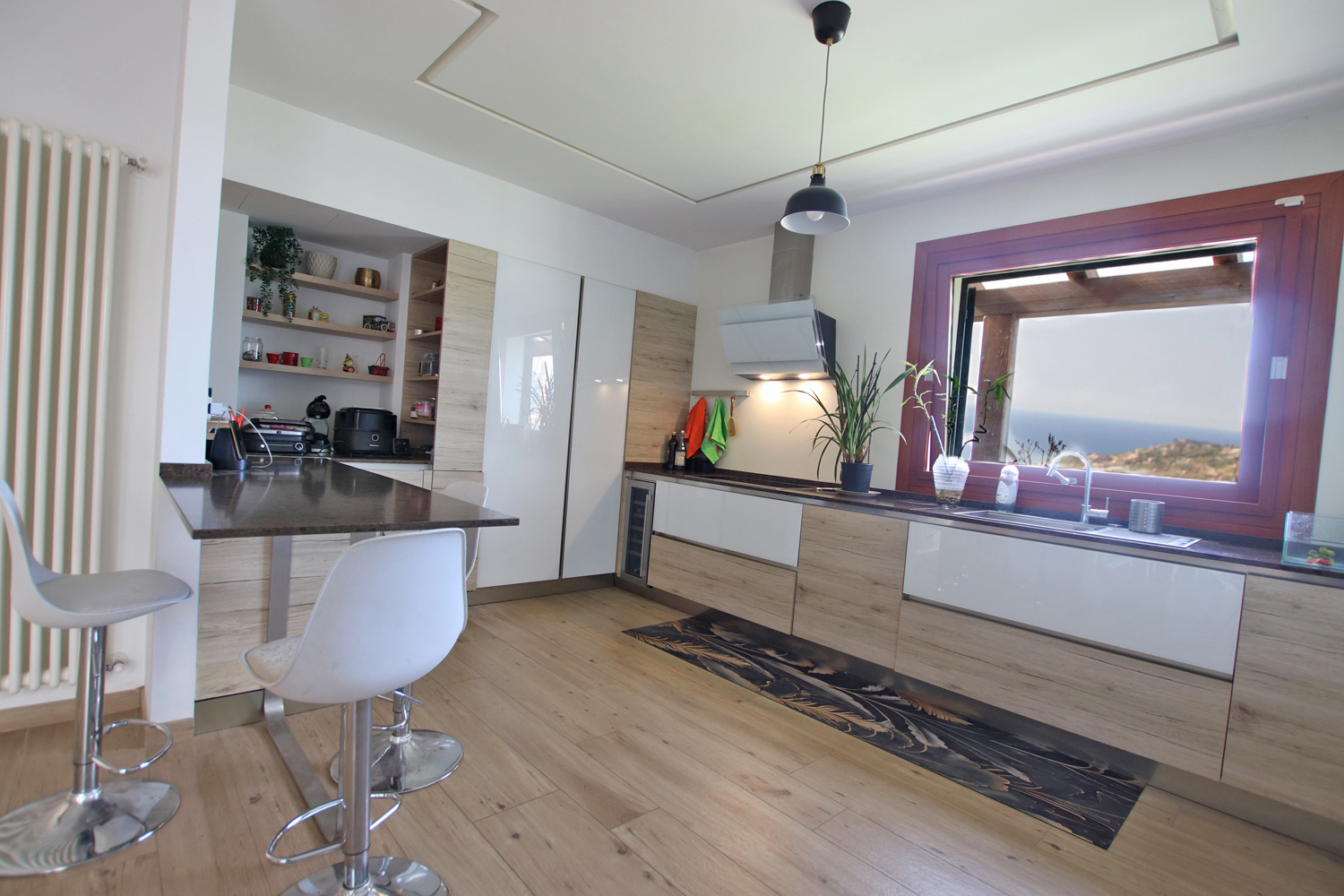 The kitchen is generously sized and fully habitable, featuring a panoramic window above the sink that frames a stunning sea view—an ever-changing natural backdrop that brings light and beauty into everyday living.