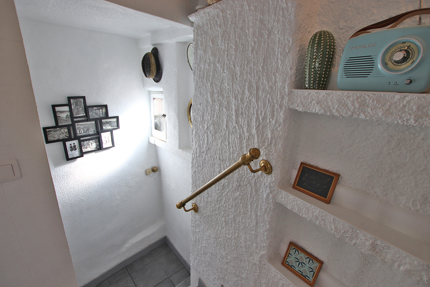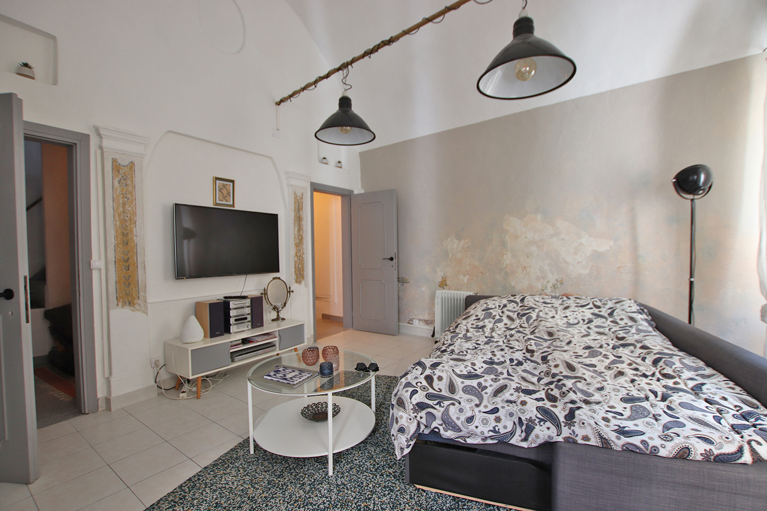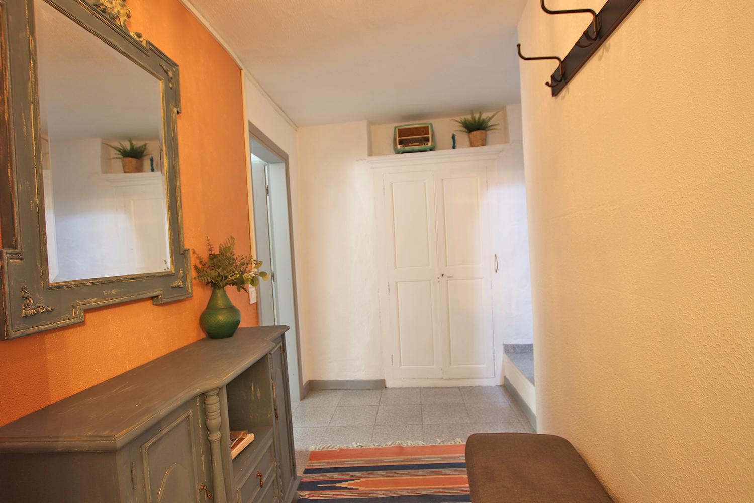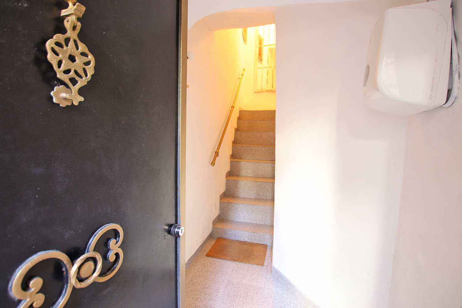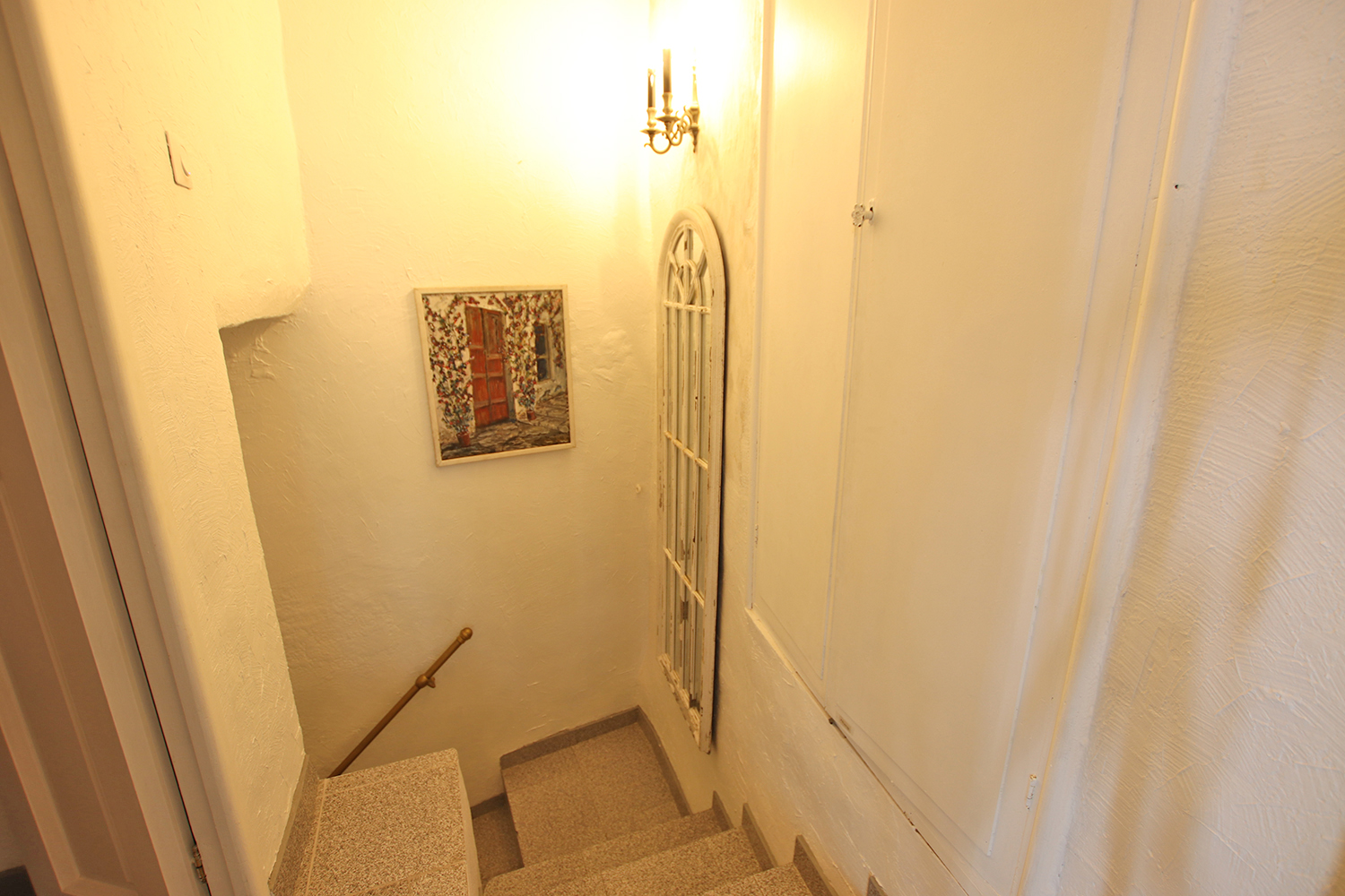 Bostaden är på tre våningar och består av entré på bottenvåningen, sovrum/vardagsrum plus hall på första våningen, badrum på mezzaninen och kök samt en 16 kvm terrass på övervåningen. En modern värmepump och luftkonditionering är installerad i köket. Väggarna i sovrummet/vardagsrummet på första våningen är målade i en blandning mellan antika fresker och modern stil. Bostaden säljs fullt möblerad och utrustad.