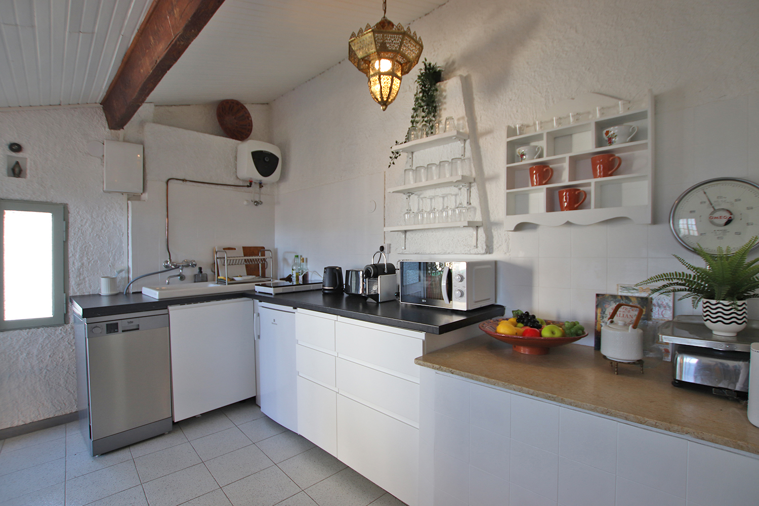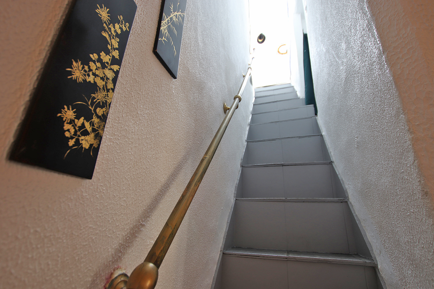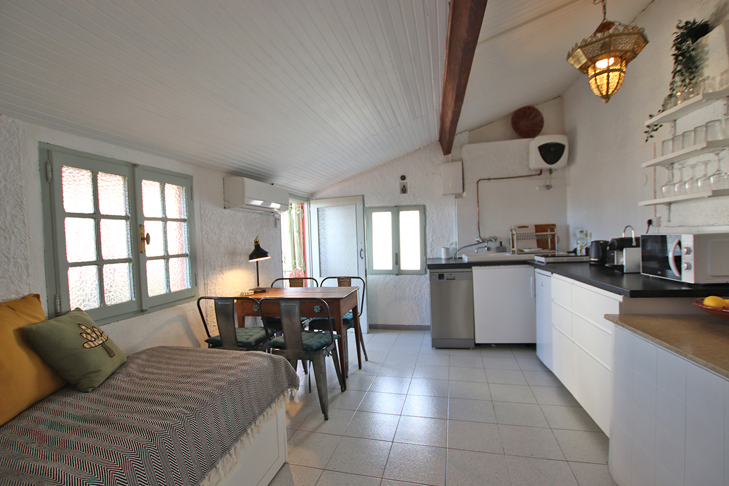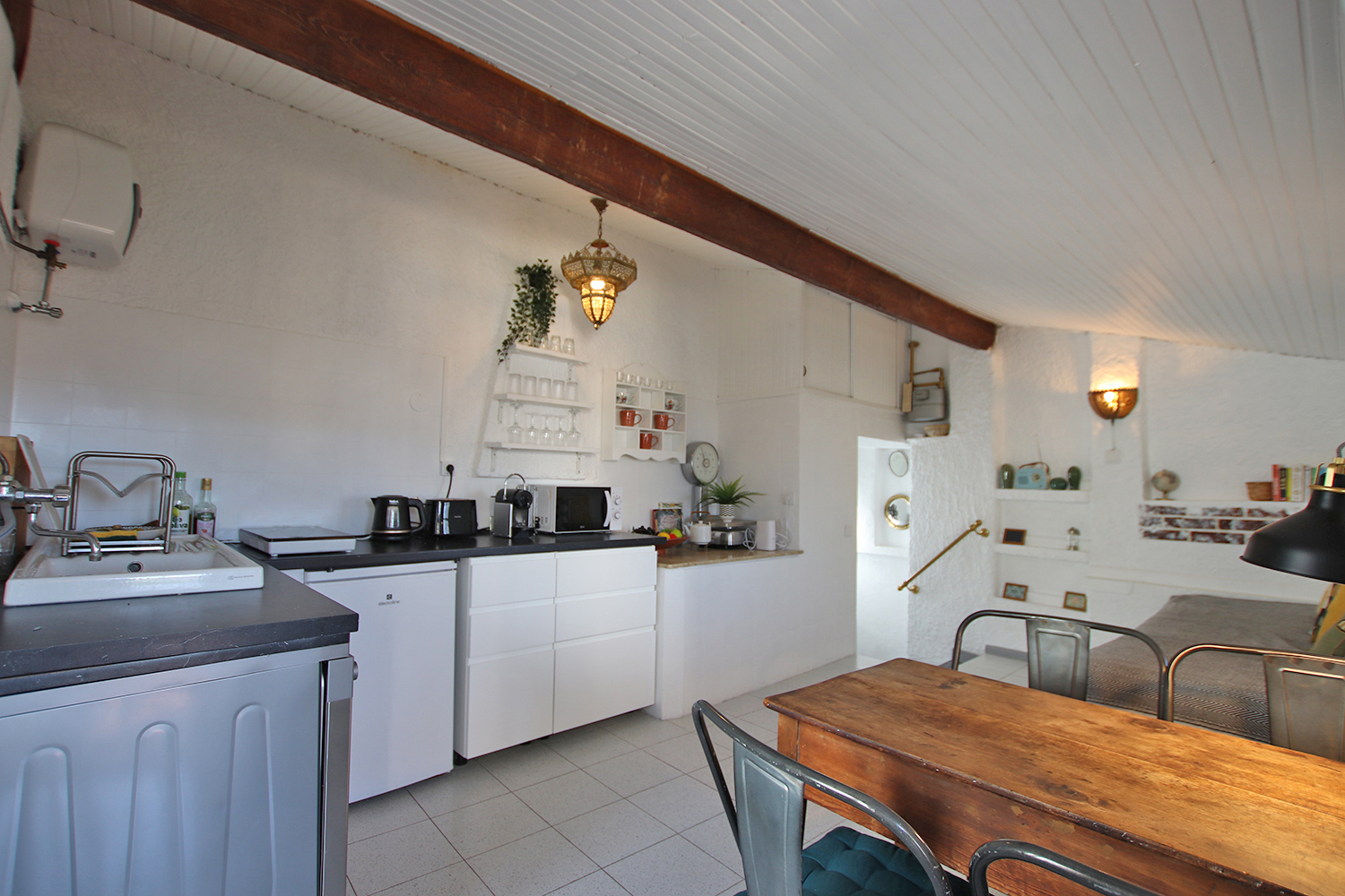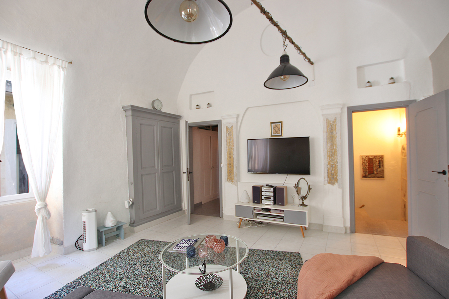 Bostaden är på tre våningar och består av entré på bottenvåningen, sovrum/vardagsrum plus hall på första våningen, badrum på mezzaninen och kök samt en 16 kvm terrass på övervåningen. En modern värmepump och luftkonditionering är installerad i köket. Väggarna i sovrummet/vardagsrummet på första våningen är målade i en blandning mellan antika fresker och modern stil. Bostaden säljs fullt möblerad och utrustad.